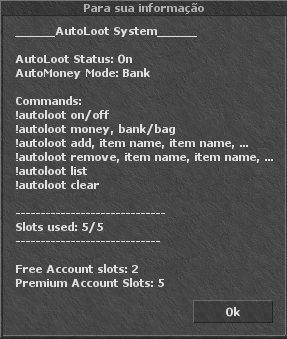 O sistema Autoloot te auxilia na hora de fazer seu loot, ele poderá coletar os itens que você configurar, além de coletar gold automaticamente e envia-los direto a sua conta do banco. OBS: não é necessário falar !autoloot gold, ele já vem ativo automaticamente!