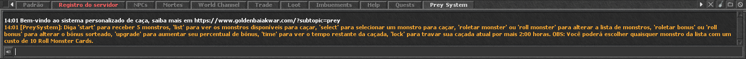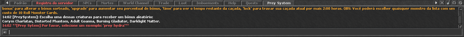 ➤ Card Prey Roll Monster: Usando esse item você ganha +1 roll monster, o roll monster serve pra trocar a lista de monstros da sua prey, caso tenha vindo uma lista que não seja agradável de caçar (lembrando que a lista é aleatória) você pode digitar roll monster no chat prey system, isso trocará pra outra lista de 5 monstros.